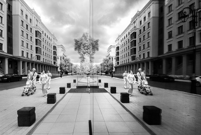 Инфракрасный городской пейзаж с людьми и отражениями.