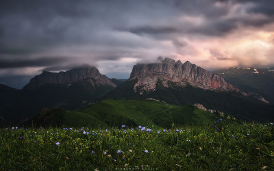 Природный парк Большой Тхач. Предзакатный вид с г. Асбестная на массив Чёртовы ворота, образующийся горами Восточный Ачешбок (слева, 2440м) и Западный Ачешбок (2486м).