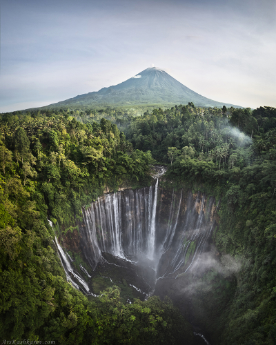 "Вид на Семеру" Tumpak Sewu - самый красивый водопад Индонезии. Джунгли, водопады и вулканы - три главных объекта для съемки для пейзажиста в этой стране. Здесь все они умещаются в одном кадре! Сам водопад представляет собой огромный обрыв, высотой более 150 метров, в форме полукруга. Потоки воды стекают практически по всей его площади. Помимо речного русла в пропасть низвергаются десятки небольших подземных водопадов. На фоне падающей воды и в окружении тропического леса возвышается гора Семеру. Это самый высокий вулкан на острове Ява, а также один из самых активных. |