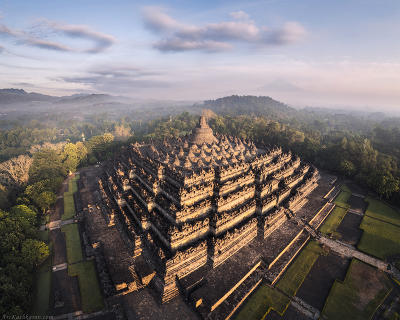 "Боробудур" Боробудур возведён как огромная ступа, выполненная в форме мандалы. Фундамент ступы — квадратный, со стороной 118 м. У ступы имеются восемь ярусов: пять нижних — квадратные, и три верхних — круглые. Форма мандалы представляет схему мироздания в соответствии с буддийскими представлениями. На верхнем ярусе расположено 72 малые ступы вокруг большой центральной. Каждая ступа в форме колокола. Внутри ступ находятся статуи Будды и барельефы на религиозные сюжеты |