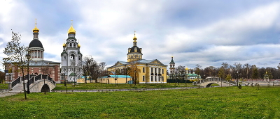 Храмовый комплекс в Рогожской слободе Слева на право, Зимний храм Рождества Христова, Церковь Успения Пресвятой Богородицы в колокольне, Кафедральный собор Покрова Пресвятой Богородицы, Церковь Николая Чудотворца. |
