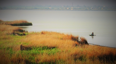 Озеро у пос Ивановка.Слева от камышей Чёрное море. В ожидании сына забралась на гору,посмотреть издали озеро. Вечереет. Красиво..На том берегу посёлок.