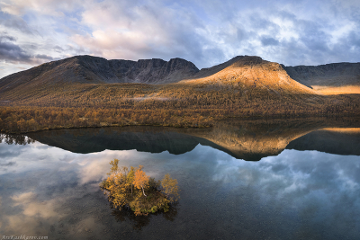 "Хибины в отражениях" Горы Хибины считаются одним из лучших мест для съемки золотой осени. Однако, далеко не каждый день они радуют фотографов такой красотой. Причина тому – погода. Осенью небо здесь часто хмурое, поливает дождь и дует сильный ветер. В то утро мне повезло |