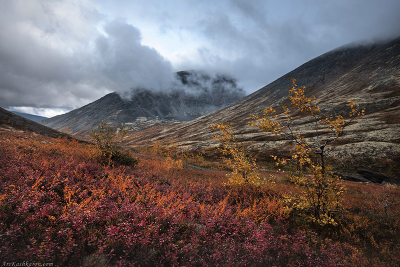 "Тундра осенью" В сентябре тундра окрашивается в цвета осени. Карликовые березки становятся ярко оранжевыми, кустики голубики багряно-красными, а деревца и поросль березы Черепанова золотисто-желтыми |