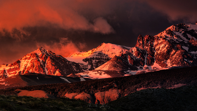 Анды в первых лучах Стоя под порывами ледяного ветра в ущелье в темноте, где внизу извивалась едва видная речка, я ждал, когда солнце, которое должно было взойти за моей спиной, осветит пик Фицрой передо мной. Однако он оставался темным. И тут я заметил, как горная гряда слева от меня зажигается каким-то невероятным светом. Солнца я видеть не мог, но там, наверное был сумасшедший восход. В течение нескольких минут цвета перешли от кроваво-красных к сине-фиолетовым. Жаль, что здесь нет возможности дать серию кадров. |