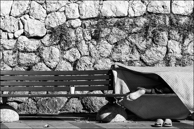 Скамейка какая-то длинная, видать там много кто так отдыхает. И не стыдно вам, чалавек культурно спит, а вы его в камеру... Ай яй яй