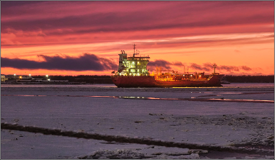 Архангельск. Вид на Северную Двину в районе морского вокзала. Декабрь. Вечереет.