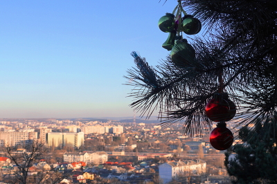 Вид на город с горы.Растущую ёлку украсили принесёнными игрушками.