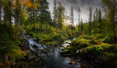 Кольский полуостров, Мурманская область, горный массив Хибины, место слияния Безымянного ручья (слева) с ручьем Юмьекорруай, сентябрь 2023 года