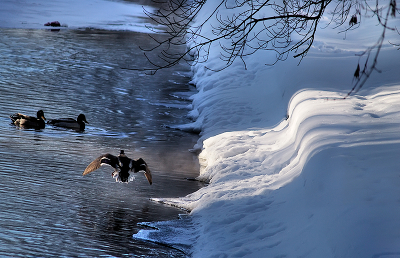 Ух,как зима заморозила берег! а речка не поддалась-уткам повезло!