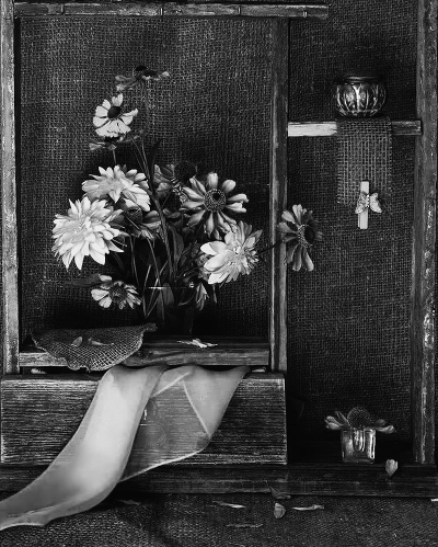 Букет чуть левее, платок расправить, рамку-паспарту убрать, тогда букет можно так оставить, (либо тоньше оставить, либо как-то шире брать), сместить любой предмет из правой части, что бы не были на одной линии.... а так задумка неплоха....