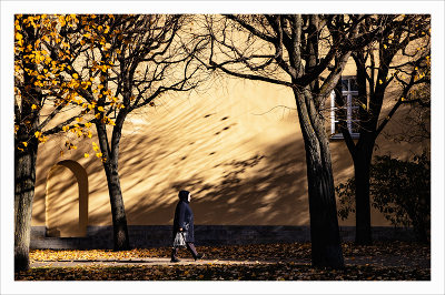 Доброго дня, Елена. Неплохая работа и нравится. Позволил себе пофантазировать и представил, вместо идущей в кадре бабушки, летящий воздушный шарик с верёвочкой,с тем- же наклоном, что и тени на стене... Показалось интересным... Спасибо.