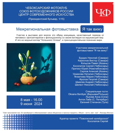 Севе Рус, В общем, случилось. Спасибо коллегам за участие, встреча прошла в "тёплой дружественной обстановке". Всё ещё под впечатлением, очень хорошо пообщались, не поленился приехать Алексей Серпов из Казани.«Я так вижу» - многожанровая выставка, проходящая под девизом «Искусство повсюду!», объединила в себе натюрморт, фаунд-арт, стрит, абстракции в различных интерпретациях, от классических до самых современных метафизических, концептуальных. Зрителя ждёт встреча со сложносочинёнными и нерукотворными, найденными, случайными, «забытыми» сюжетами, создающими калейдоскопичные арт миры, в которых предметы, цвета и фактуры сочетаются и преображаются, ярко представляя себя, становясь определёнными символами и неся некий смысл. Среди участников выставки известные и совсем новые имена местных авторов, фотолюбителей Поволжья и других городов страны и зарубежья. Для некоторых из них участие в проекте - своего рода трамплин в творческое пространство, а для большинства зрителей возможность вдохновиться, сделать маленькие открытия и даже воскликнуть: «А что, так можно?!». |