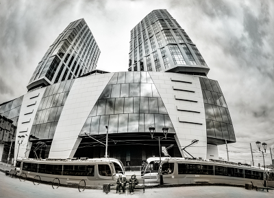 Городской этюд с небоскрёбом, трамваями и бомжами
