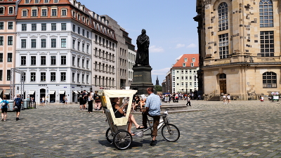 Рикша -экскурсовод. Новый рынок-одна из центральных площадей в Дрездене. В центре памятник М. Лютеру-единственное, что уцелело на этой площади во время англо-американской бомбардировки 13-15 февраля 1945 г. На первом плане рикша-экскурсовод по Дрездену. |