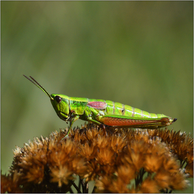... из жизни кузнечиков. Трагедии мира насекомых порой нам не заметны. У этого представителя прямокрылых отсутствует задняя правая конечность, что и дало возможность сфотографировать не среди травы, а на усыхающем растении. |