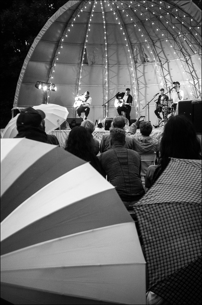 Кадр интересен, с точки зрения позиции автора, что автор хотел показать. Тут чётко просматриваются два варианта, концерт под дождём, и интересное геометрическое построение, но автор снял так, что получились "качели", ни туда, ни сюда. Для первого варианта слишком много низа, да и верха, что бы кадр по первому варианут работал, надо было хорошо подрезать низ, и чуточку сверху, до квадрата. Если рассматривать второй вариант, то по хорошему,точку съёмки надо было бы чуть опустить и "клювом" чуть вверх, подрезая практически всех зрителей и открывая верх эстрадной "ракушки". Автор может сам проверить как это работает. Создайте два слоя, в верхнем слое оставьте только зонтики, и двигайте го вверх, увидите как изменится восприятие кадра. Приношу извинения, что влез со своим суждением под вашу работу, но думаю, что такой совет в будущем может пригодиться.
