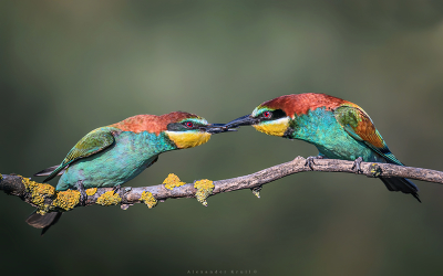 Ухаживания золотистых щурок. Иногда достаточно даже небольшого насекомого, чтобы сделать даме приятно и привлечь ее внимание.