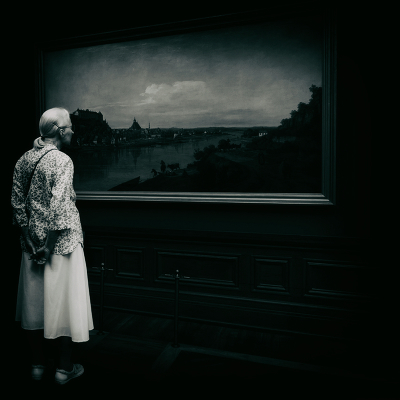 Мне здесь видится этакая концепция картина-окно.Линейная перспектива как бы затягивает туда, вглубь изображения, открывает иной мир. Детали интерьера интересны и кроссовки с платьем :-)