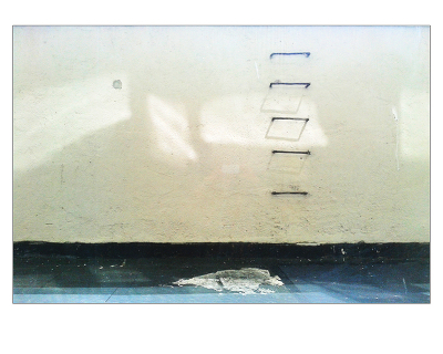 Скажем так, я вижу плоскость - это стена, которая неоднородна в пространственном смысле. Эти пятна на стене как бы углубляют плоскость. Причем на нее, плоскость наложены предметы, скобы. Возникает некоторое противоречие между плоскостью и материальным :-) А внизу остатки ненужной обществу стены, которая покоится в море