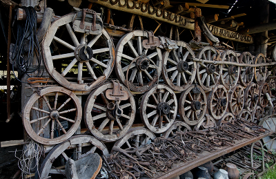 XVIII век, шиномонтаж при кузнице. Металлическая полоса снаружи колеса называется шина. Шины меняют в кузницах . Это частая поломка, поэтому у многих кузнецов были колёса на замену, так же, как и подковы. |