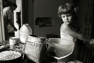 Посмотрите почту. Хорошее фото, из тех времен, давних. Девочка как главный обьект приковывает вниманиеи, следовательно, к корыту. Не назойливо проступает ЗП с женщиной, что украшает снимок