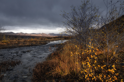 Пасмурным днём Дождь ненадолго прекратился, над горами появилась полоска света, через которую пыталось пробиться солнце. Едва успев снять несколько кадров, тучи опять сомкнулись и пошёл дождь. Республика Саха (Якутия). Оймяконский улус. Хребет Сунтар-Хаята. 08 сентября 2024 |