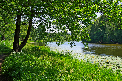 Верхний Кузьмински пруд в природно-историческом парке Кузьминки-Люблино в Москве. Июнь 2023.