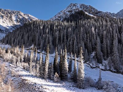 Несмотря на мороз, снег с южной стороны ёлок растаял за один солнечный день. Национальный парк «Ала-Арча», Тянь-Шань