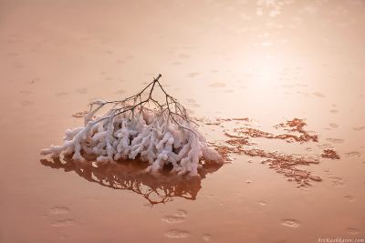 Веточки перекати-поля обрастают солью и выглядят как солевые кораллы. Калмыкия, Меклетинский заказник