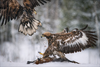 Пух да перья .. Две самые крупные птицы средней полосы - орлан-белохвост и беркут встретились на приваде. Обычно орлан сразу же уступает добычу беркуту. Но тут орланов было несколько и просто так улетать они не хотели, хотя в итоге беркут лису у них отобрал. Беларусь, заказник «Красный Бор», январь 2024г © PHOTOTRAVEL.PRO |
