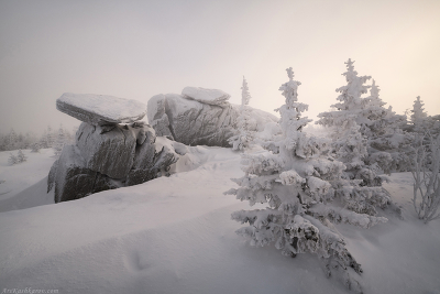 "Камень кепка - Таганай" Камень-кепка – популярное место для фотосессий. Мне повезло, я снял это место с туманов в мягком утреннем свете. После метели все следы пребывания людей на этой локации замело снегом |