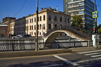 Золоторожская набережная реки Яуза в Москве и Таможенный мост. Сентябрь 2023.