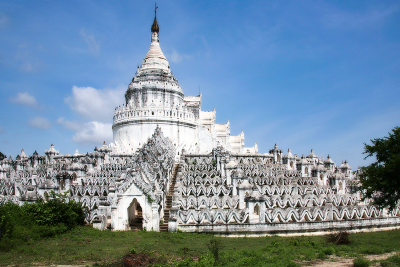 Пагода Синбьюме Пагода Hsinbyume выкрашена в белый цвет и построена по образцу священной буддийской горы Меру. Была построена в 1816 году Багидо. Она посвящена памяти его первой супруги и кузины, принцессы Хсинбьюм (букв. «Принцесса Белый Слон», 1789–1812), которая умерла при родах. Дизайн пагоды сильно отличается от норм дизайна бирманских пагод. Он основан на описаниях мифической пагоды Суламани на горе Меру, а нижняя часть пагоды представляет собой гору. Семь концентрических террас представляют семь горных хребтов, поднимающихся к горе Меру согласно буддийской мифологии. Пагода сильно пострадала от землетрясения в 1838 году и была восстановлена королём Миндоном в 1874 году. Снова сильно пострадала, большая часть конструкции обрушилась во время недавнего землетрясения. https://i.postimg.cc/ydc0Rx8M/after.jpg |