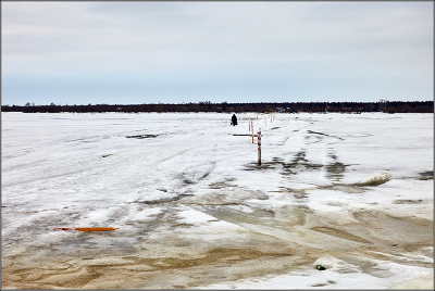 Апрель. Пешеходная переправа на островные территории с окраины Архангельска.