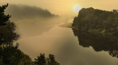 Над рекою туман расстилается .