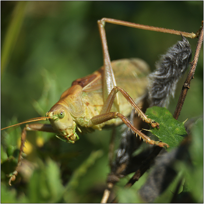 Тяжелая жизнь кузнечика. Кузнечик бородавочный - Decticus verrucivorus. Окраска различная (зелено-черно-бурая). Живет на влажных и сухих лугах в полях.не потревоженный, передвигается пешком. Прыгает далеко. Ест насекомых, иногда растения. |