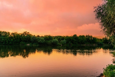 Закат над речкою алел, то зажигался,то бледнел.