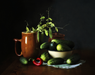 Добрый вечер, Вахтанг! Мне понравилось. Немного смущает контраст, чернота слева, и я бы перчик с огурцом немного "оторвала" от кружки с горохом и выдвинула вперёд. Пишу первое, что приходит в голову, не сердитесь)