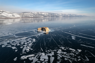 "Структура Байкальского льда" Взглянув на застывший Байкал с высоты, осознаешь как разнообразен лед . Идеально гладкие и прозрачные ледяные поля, рассеченные линиями трещин и нажимов, сменяются мозаикой вмерзших льдинок |