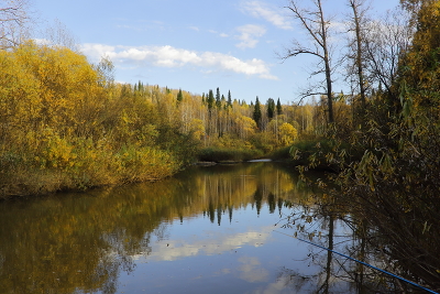 Золото осени Это место одно из излюбленных мест фото съемки, но беда в том, что таежная река стремительно зарастает кустарником и закрывает вид на отражение, но есть вариант, весьма рискованный: здесь проложены 2 водосточные трубы большого диаметра, на них можно спуститься, но держаться практически не за что, куст калины за спиной в воде хилый. На мое счастье рыбак не успел уйти и помог мне держаться, балансируя. Радость меня захлестывала |