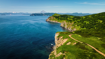 Мыс Маячный на входе в Авачинскую бухту. На дальнем плане вулкан Вилючинский, ещё дальше Мутновский