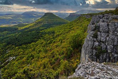 Крым, плато Чуфут-Кале. Вид на Тепе-Кермен и Качинскую долину