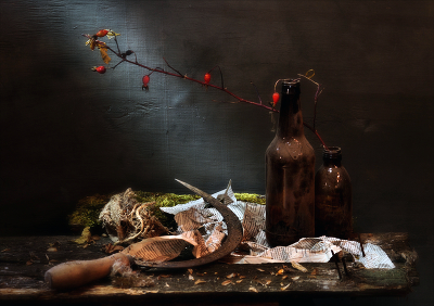 Александр Чумаков, Доброго дня, Александр. Согласен с Вами, Александр, относительно рваных газет - главной детали Вашего снимка, помешать они не могут по определению!!!, хорошая и интересная задумка ,а вот серп, явно не у дел (смахивает на кич...) и если серп из кадра убрать, оставив остальное как есть, включая рваные газеты всё и случится, но маленькая деталь..., одинокую ягоду шиповника торчащую из большой бутылки надо воткнуть (перенести) в маленькую бутылку и развернуть её в противоположную сторону... Спасибо.
