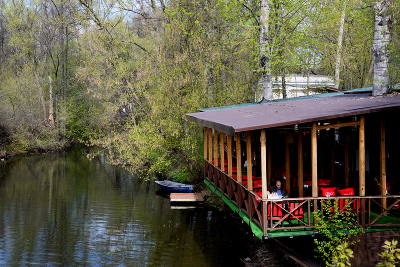 Кафе на Нижнем Кузьминском пруду в Кузьминском парке в Москве. Апрель 2024.