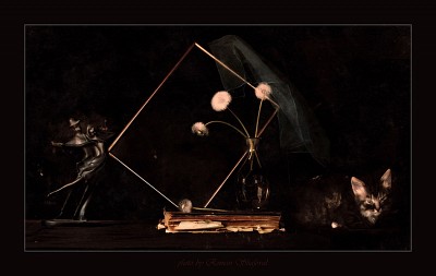 Мне кажется слишком много предметов. Я бы фигуру убрала или и фигуру и кота. Посмотрите так
