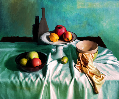Хороша обработка "живопись" Эффект сияющего цвета нравится. Мне кажется, немного выпадают по стилю два контура бутылок слева.