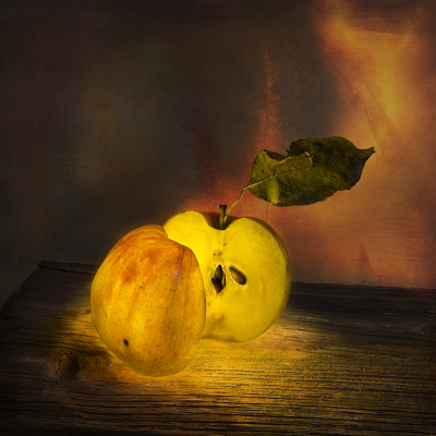 фотограф собственно в исходнике , а там реально светящееся яблочко сделанное фотографическим способом , вот я тоже думаю , может я чересчур фактурами увлекся , фон слишком активен , и крадет реализм , я в сомнениях , может сделать вариант " как было " ?