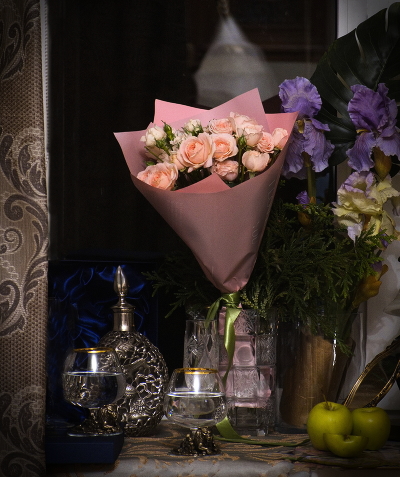 The Birthday evening with reflections in the night window? flowers? presents, and warmth