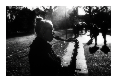 Полный кадр здесь гармоничен. Верхний льющийся свет озаряет музыканта и добавляет воздуха на сцене. Дорожка создает светлый контрастный фон для саксофона и расширяет его значимость и выделяет его дополнительно. Люди-тени уходят вверх как ноты-музыка, которую играет женщина. Визуальные звуки уходя вверх превращаются в солнечный свет и круг замыкается.